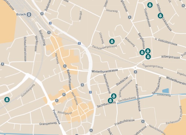 Auf dieser Karte sind alle Gärten eingezeichnet, in welchen wir bereits eine Beratung durchführen durften. Die Auszeichnungen folgen (hoffentlich) bald. Bis jetzt haben Beratungen in Bülach und dem Stadtteil Leimbach stattgefunden.